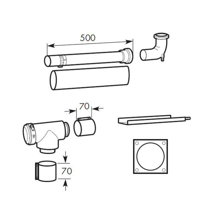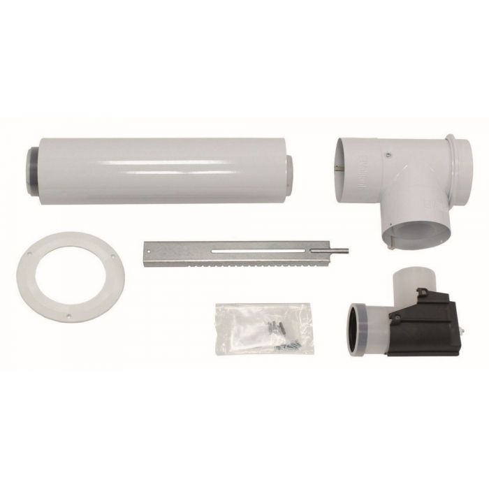 Concentric set Ø 80/125 with outlet Ø 80, 1 elbow 87°, 1 extension 50 cm and 1 elbow 90° Ø 80 with support.
