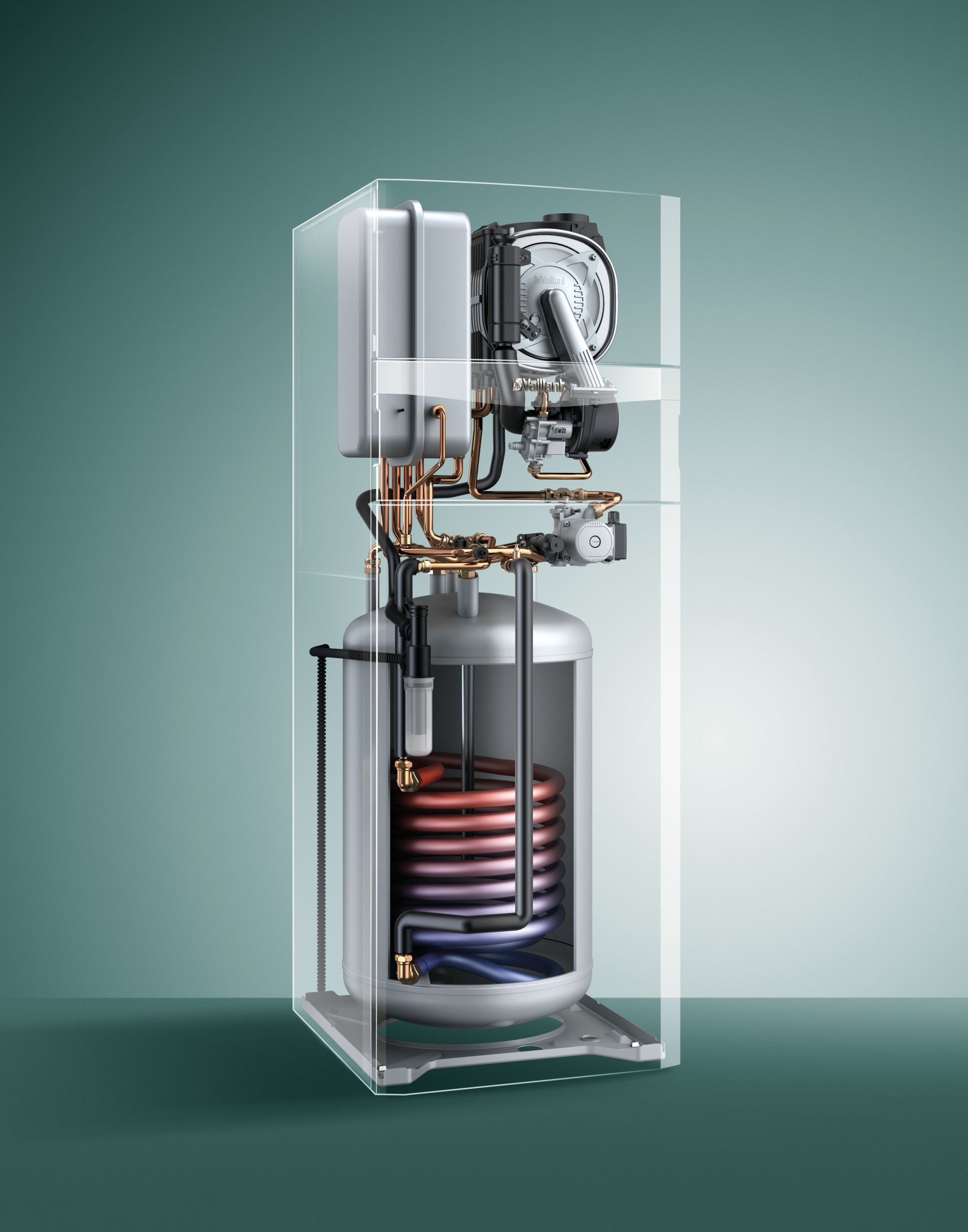 Verwarming en tapwaterproductie via geïntegreerde boiler van 150 liter.