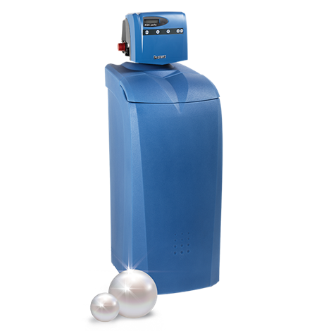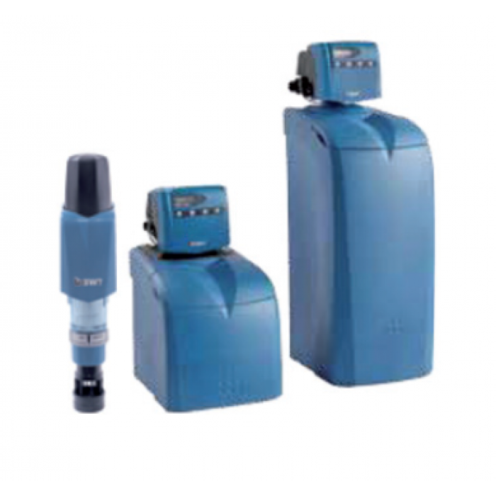Cet adoucisseur est rempli de résine échangeuse de cations monodispersée, à base de sodium. L'eau qui traverse la résine emporte le calcium et le magnésium en échange d'une quantité équivalente d'ions de sodium. Lorsque la résine est saturée de calcium et de magnésium, elle sera réactivée par régénération avec une solution saturée de sel de régénération. En raison de la granulométrie régulière de la résine échangeuse de cations monodispersée la consommation d'eau et de sel est très faible.